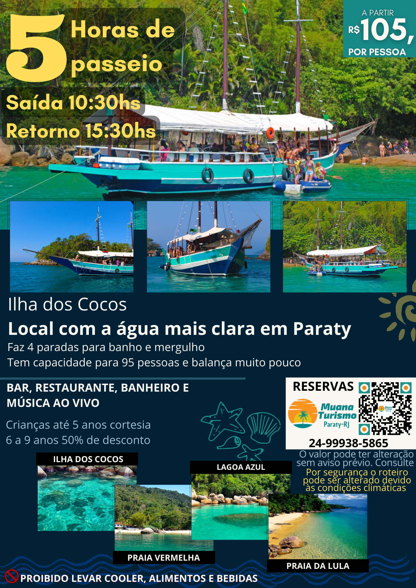 Venha viver um dia inesquecível em Paraty! Navegue por águas cristalinas e mergulhe nas belezas da Ilha dos Cocos. Paradas para banho e paisagens de tirar o fôlego!