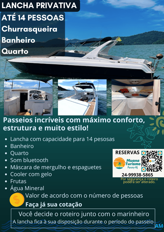 🚤 Lancha Privativa com suíte para até 14 pessoas – Conforto e Diversão no Mar de Paraty! 🌊
